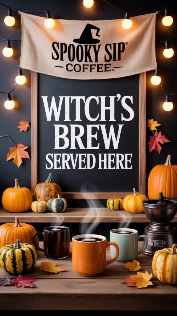 Add personality with a spooky sign to complete your coffee bar look. Use a small chalkboard or framed print with phrases like “Witch’s Brew Served Here,” “Death Before Decaf,” or “Espresso Patronum.” Place it above your station or prop it up on the counter. For a rustic vibe, use wood signs painted in black with white lettering. This simple touch makes your space feel more styled and adds a photo-ready Halloween vibe.