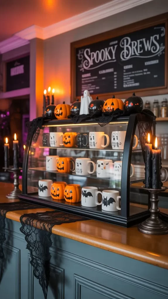 Why settle for plain mugs when your collection can be part of the decor? Swap out your everyday mugs with spooky designs—skeletons, witches, pumpkins, ghosts, or bats. Hang them on hooks above your coffee bar or line them neatly on a shelf. A mix of ceramic and enamel mugs adds variety. You can also DIY by painting plain mugs with Halloween decals or stickers. This hack not only adds visual charm but also makes every cup of coffee feel like part of the Halloween celebration.