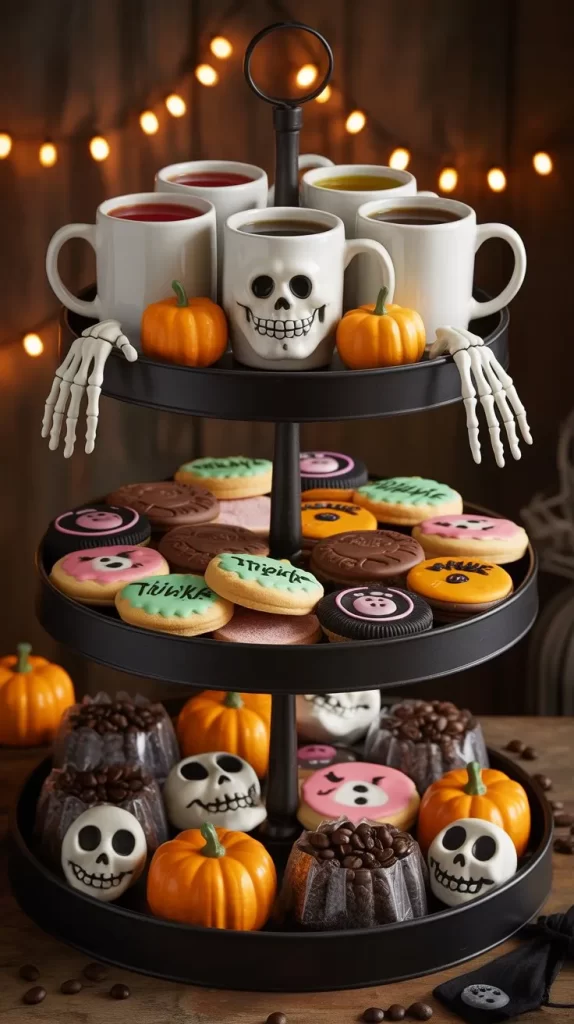 Tiered trays are perfect for organizing and decorating. Use one to display mugs, syrups, spoons, and napkins while decorating with small pumpkins, skeleton hands, or mini cauldrons. A black or wooden tiered tray works best for a Halloween theme. This hack saves counter space while keeping your coffee bar festive and functional.