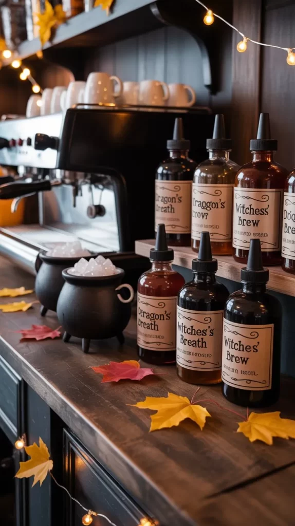 Don’t let syrup bottles look boring. Wrap them with Halloween-themed labels to make them look like magical potions. Create names like “Vampire’s Vanilla,” “Ghostly Hazelnut,” or “Frankenstein’s Caramel.” Pair with small cauldrons to hold sugar or stir sticks. This hack makes your coffee bar feel like a witch’s potion lab.