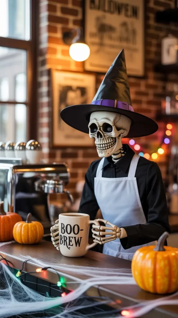 Bring humor and spookiness together by adding a small skeleton figurine at your coffee bar. Dress it up with a witch hat, apron, or tiny coffee mug in its hand. You can also pose it like it’s making coffee or guarding the candy jar. This hack is playful, festive, and guaranteed to make guests smile every time they grab a cup.