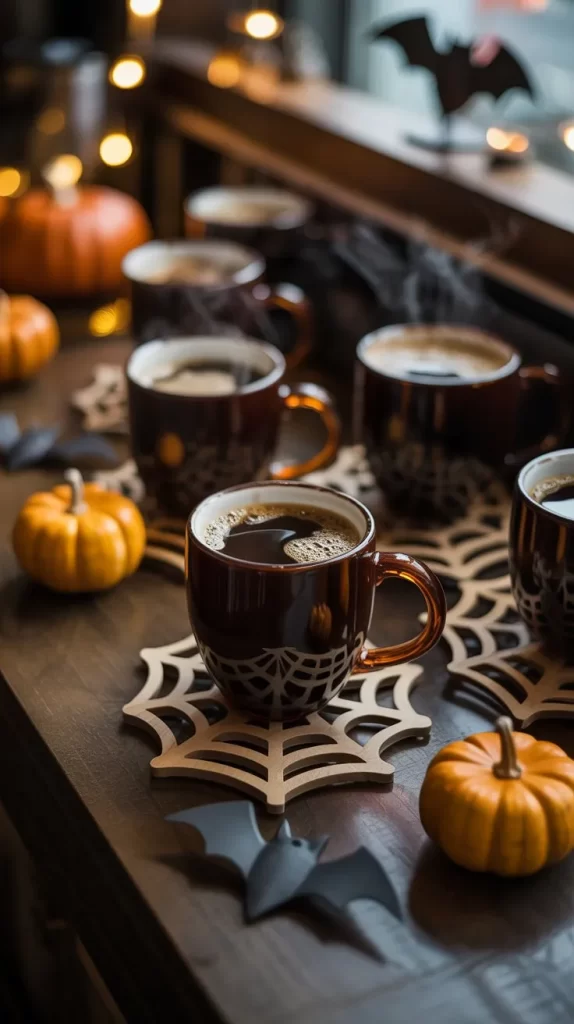 Details matter, and coasters are an easy way to upgrade your coffee bar. Swap out plain coasters with spiderweb, pumpkin, or bat-shaped ones. Choose silicone for practicality or crocheted lace for a gothic look. These small details tie your Halloween theme together while being useful for protecting your table.