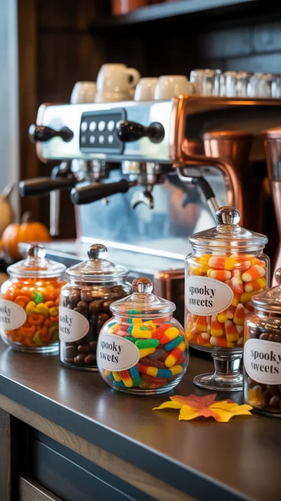 Coffee and candy are the perfect Halloween pairing. Add glass jars filled with candy corn, gummy worms, or spooky chocolates to your coffee bar. Label them with Halloween tags like “Witch’s Sweets” or “Monster Treats.” Guests can grab candy while making their coffee, turning your station into a festive, interactive setup.