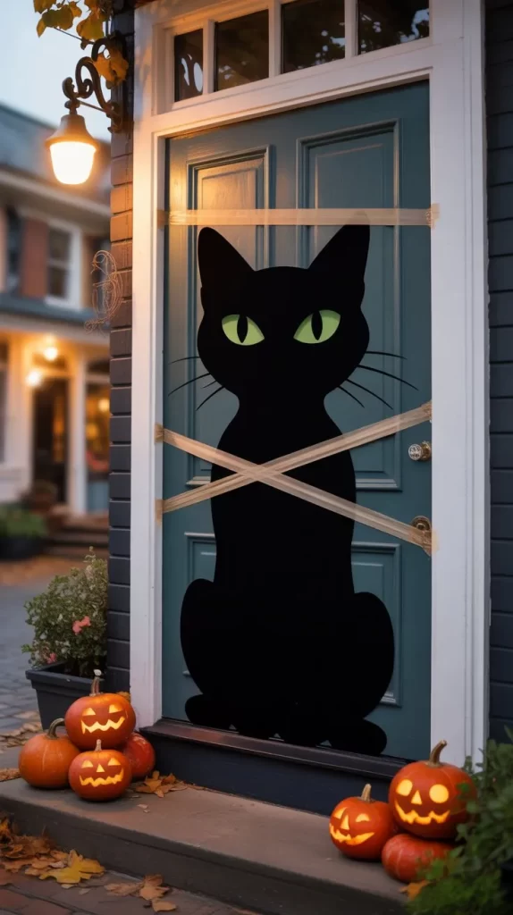 For cat lovers, cut out a large black cat silhouette and tape it to your door. Add glowing green eyes made from neon paper or LED stickers for a spooky effect. This decoration is minimal yet effective, especially for last-minute Halloween prep.