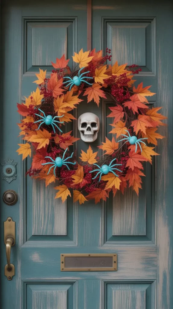 Take a simple autumn wreath (with leaves, berries, or sunflowers) and add Halloween elements like spiders, skulls, or mini pumpkins. Hang it on your front door for a blend of fall beauty and spooky flair.