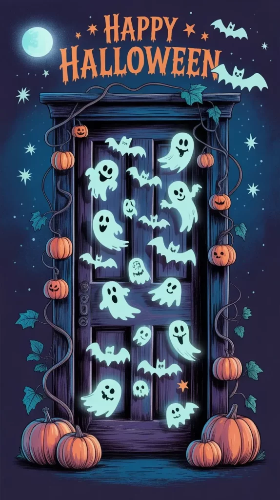 Glow-in-the-dark ghost, bat, and skeleton stickers are perfect for quick decorating. Stick them directly on your door and around the frame. They charge in daylight and shine at night, making your entryway festive and spooky without much effort.