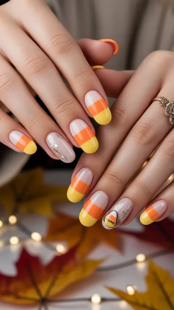 This design is playful and bright, making it perfect for both kids and adults. Using a glossy top coat enhances the candy-like effect and makes your nails look sweet and festive. These nails are ideal for Halloween events or casual parties.