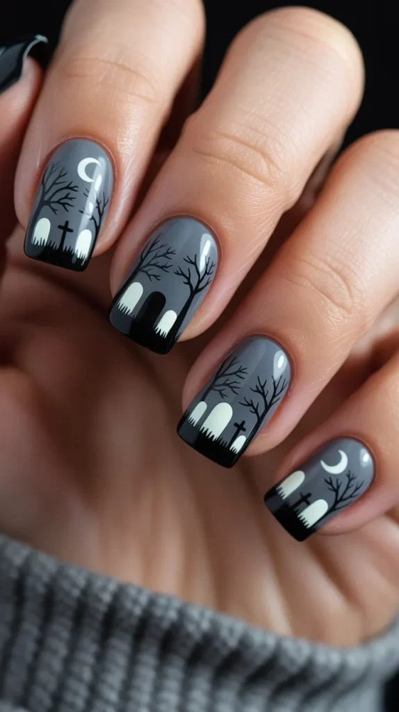 Graveyard nails are spooky and dramatic. Use a dark grey or black base and paint tombstones, bare trees, and a crescent moon on accent nails. Adding glow-in-the-dark polish or silver glitter highlights gives a mysterious effect.