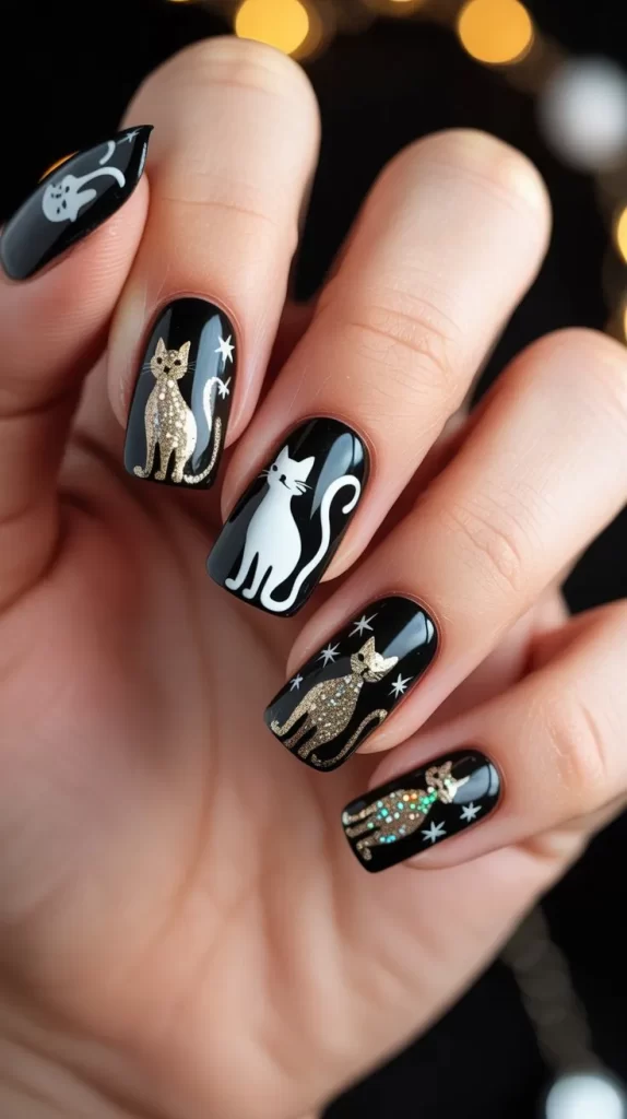 Using a shiny black base with matte cats gives a contrast that makes the design pop. Adding subtle glitter details to the background can make your black cats look mysterious and playful. This style works for both short and long acrylic nails.