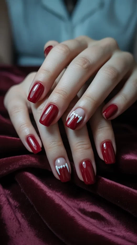 Vampire-inspired nails are edgy and thrilling. Paint nails red or dark burgundy, then add dripping “blood” effect on accent nails. You can add small fangs or bite marks using white or black acrylic for extra effect.