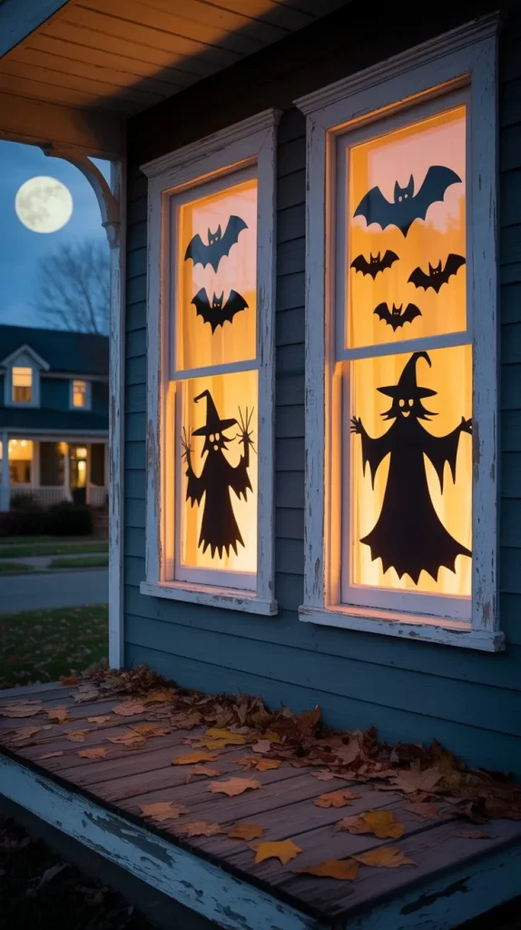 Use black cardboard to cut out witch, bat, or ghost shapes. Tape them to your porch windows so they glow at night with a lamp inside. This makes your porch look haunted without costing much.