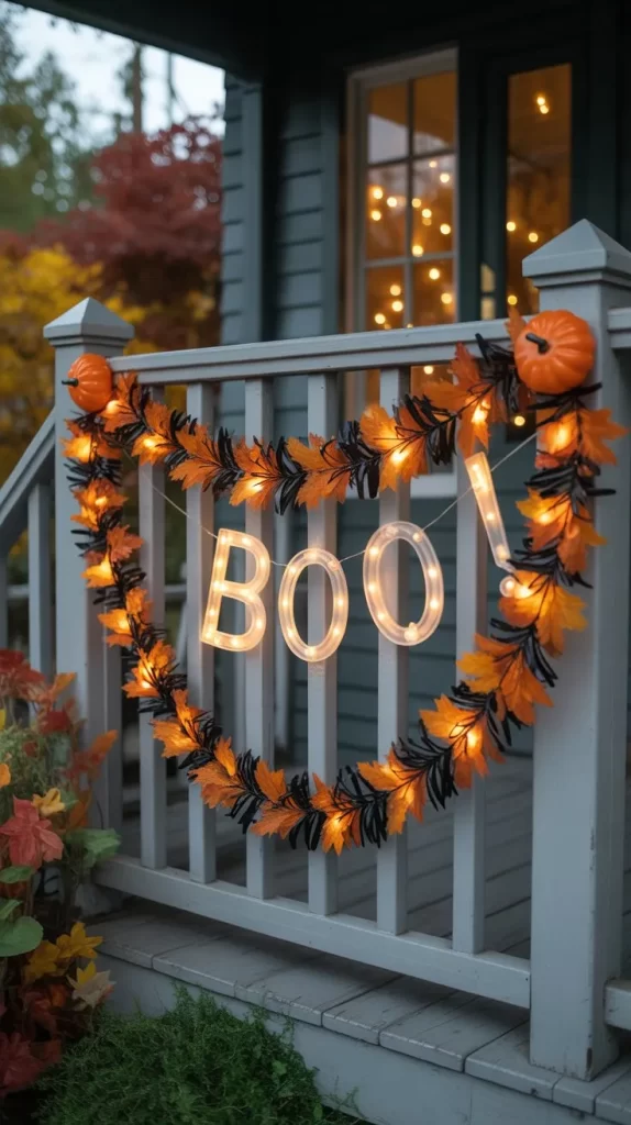 Pick up black and orange garlands from the dollar store and wrap them around your porch railing. Add battery-powered string lights for a glowing effect. It’s a quick, cheap, and festive way to dress up your porch.