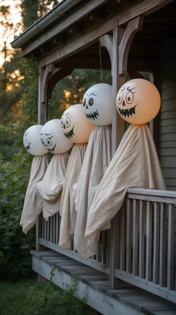 White balloons can become floating porch ghosts. Cover them with white cloth or tissue paper and draw spooky faces. Hang them from your porch ceiling with string so they move in the breeze. They look cute during the day and extra spooky at night.