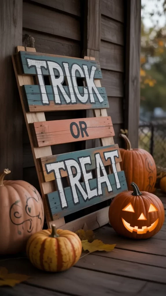 If you have an old wooden pallet, paint it with Halloween sayings like “Happy Haunting” or “Trick or Treat.” Lean it against your porch wall with a pumpkin next to it. This rustic sign is budget-friendly and festive.