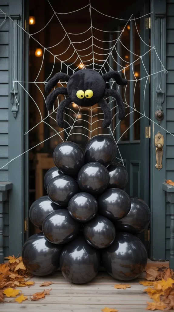 Blow up black balloons and tape them to your porch corner to form a giant “spider web” cluster. Add one large toy spider on top. This decoration is cheap but makes a huge statement.