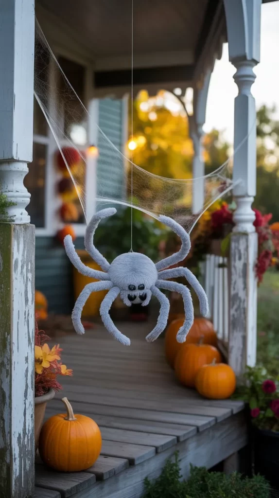 You can make giant spider webs using black trash bags. Cut the bags into web shapes and hang them across your porch railing or door. Add a big toy spider in the middle for a creepy touch. This idea costs almost nothing but makes a big Halloween statement.