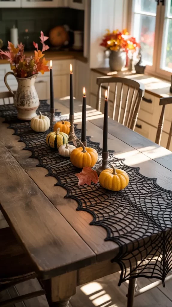 A black lace runner with spiderweb or gothic designs instantly transforms a table or dresser. Add candles, pumpkins, and small figurines for a complete look. This decor is chic yet spooky, and it doubles as fall decor beyond Halloween.