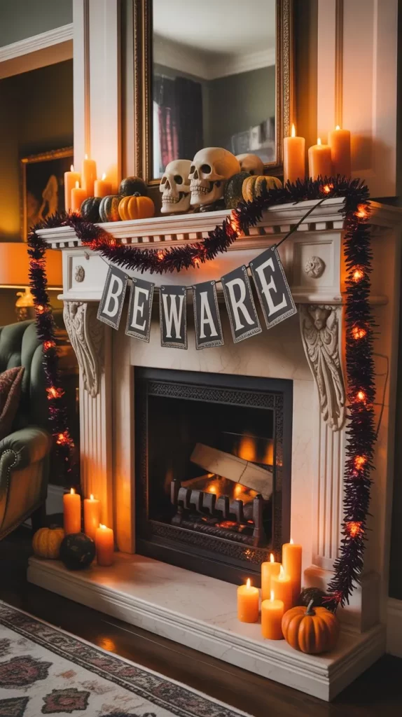 For homes with fireplaces, the mantel is the perfect Halloween focal point. Decorate with black garlands, candles, pumpkins, and skulls. Add a spooky banner like “Beware” or “Happy Haunting.” This instantly creates a haunted yet cozy atmosphere.