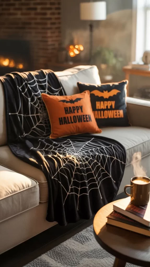 Swap your regular throw pillows for Halloween-themed ones featuring bats, witches, or skull prints. Add a plaid or spiderweb-patterned throw blanket for warmth and style. This quick update instantly makes your living room or bedroom Halloween-ready while keeping it cozy for autumn nights.
