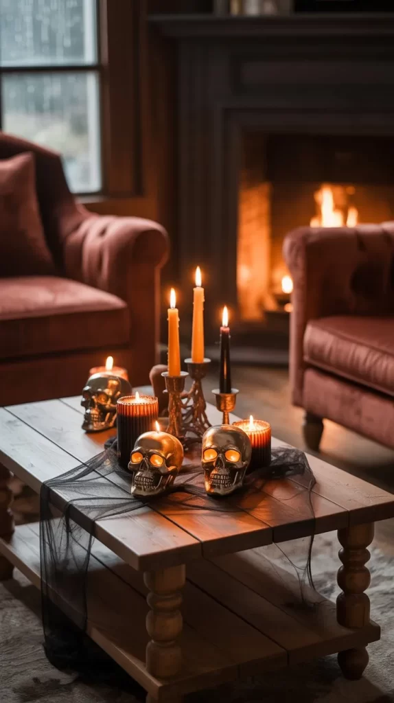 Nothing says cozy and creepy like candlelight. Use black or orange candles in skull- or pumpkin-shaped holders to set the mood. Flameless LED candles are a safe alternative, especially in family homes. Position them on shelves, coffee tables, or windowsills for a haunting glow. Pair with spiderweb fabric or fake moss for a layered, gothic feel.