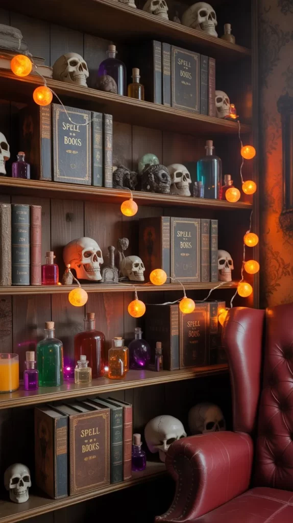 Style your bookshelf with Halloween props like old spell books, potion bottles, and skull figurines. Add dim lighting for a haunted library vibe. It’s a perfect mix of creepy and cozy for book lovers.