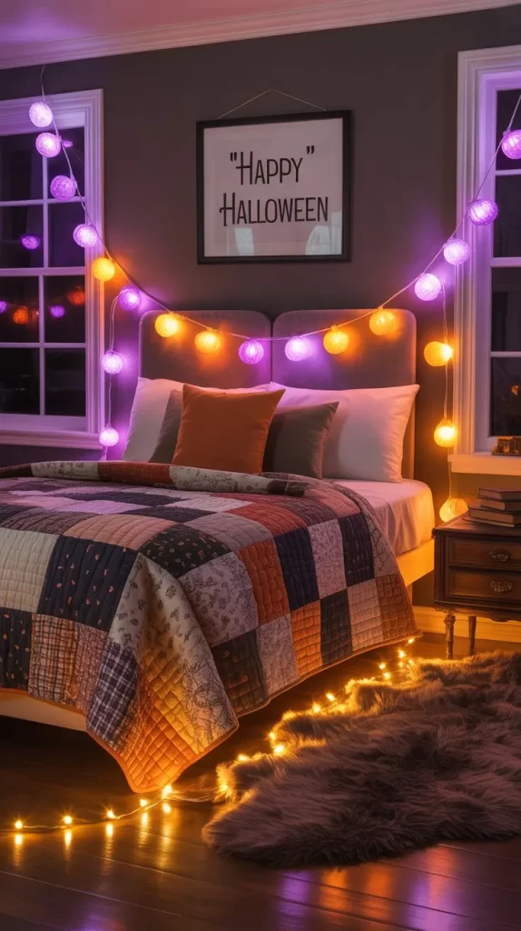 Fairy lights aren’t just for Christmas. String orange, purple, or green Halloween-themed lights around your room. They create a cozy ambiance while keeping the space festive. Wrap them around windows, bed frames, or shelves for a magical glow that kids and adults will love.