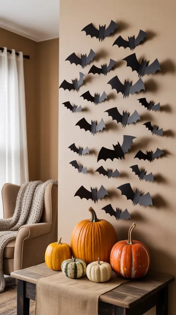 Cut out bat shapes from black paper and stick them across your walls. Arrange them as if they’re flying upward to create motion. It’s cheap, quick, and looks great against neutral walls. Perfect for last-minute decorating.