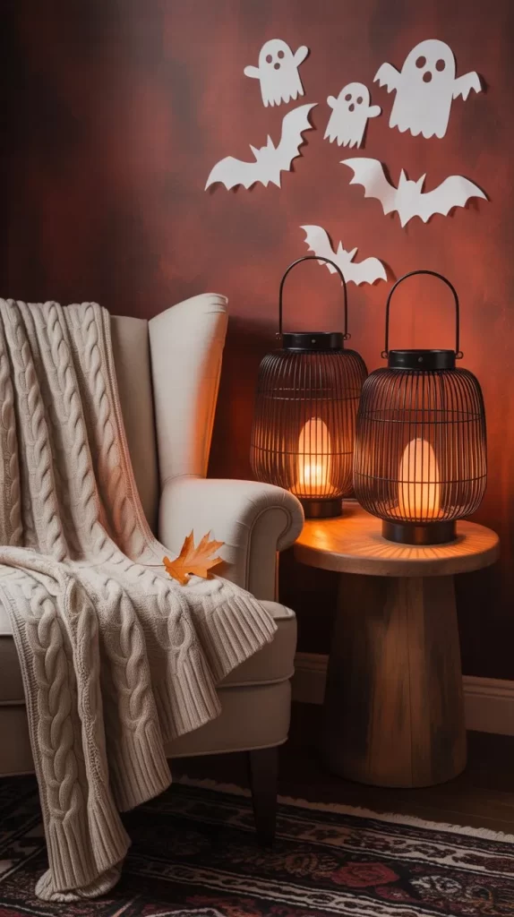 Lanterns with flickering LED lights make any space cozy and eerie. Paint old lanterns black and add Halloween cutouts (like bats or ghosts) for a DIY touch. Place them in dark corners or by the fireplace for maximum effect.