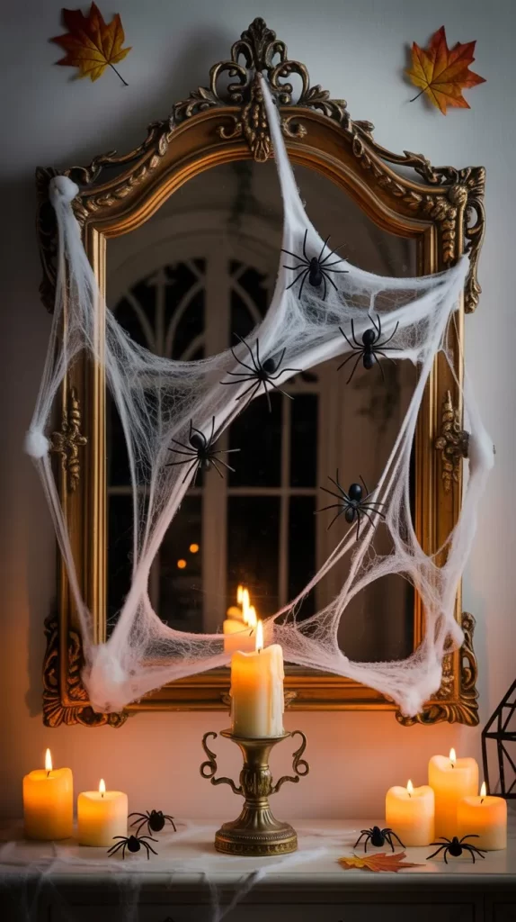 Give any mirror a spooky makeover by draping fake cobwebs across the frame. Add plastic spiders or bat decals for extra creepiness. When lights are dim, the reflection looks eerie, perfect for Halloween parties. This quick DIY instantly turns an ordinary mirror into a haunted focal point.