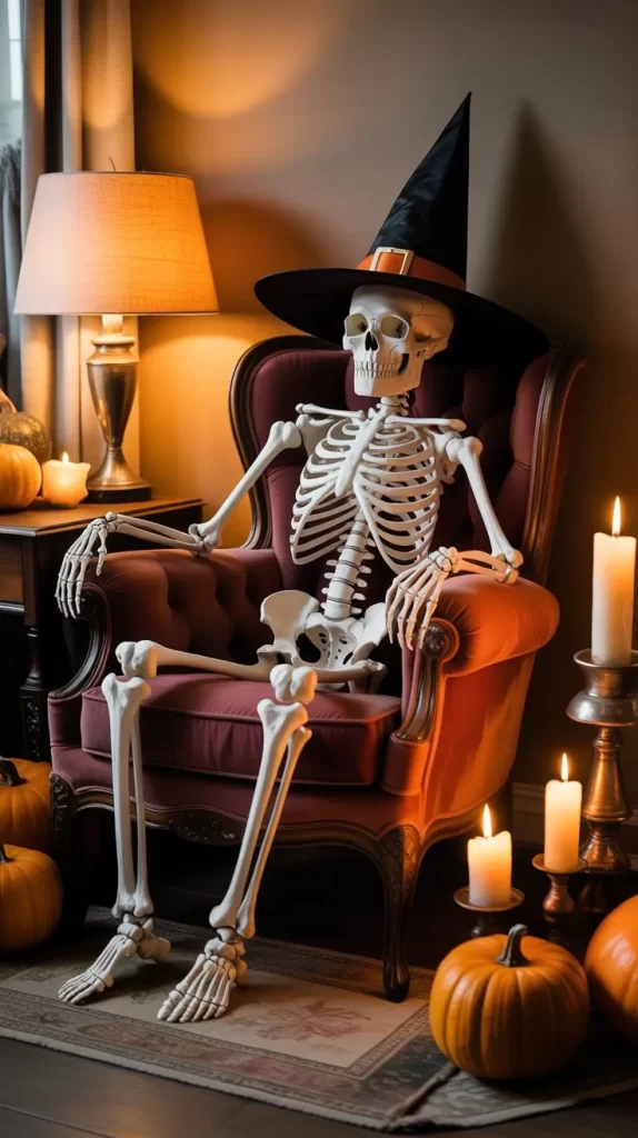 A life-size skeleton sitting in a chair instantly makes any room feel Halloween-ready. Dress it up with a witch hat or scarf for a fun twist. This statement piece is inexpensive, reusable, and always a hit during the spooky season.