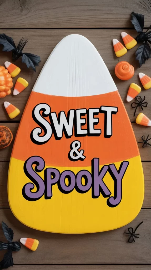 Paint a piece of wood with candy corn stripes—white, orange, and yellow. Add a fun phrase like “Sweet & Spooky.” This cheerful sign is great for kitchens.