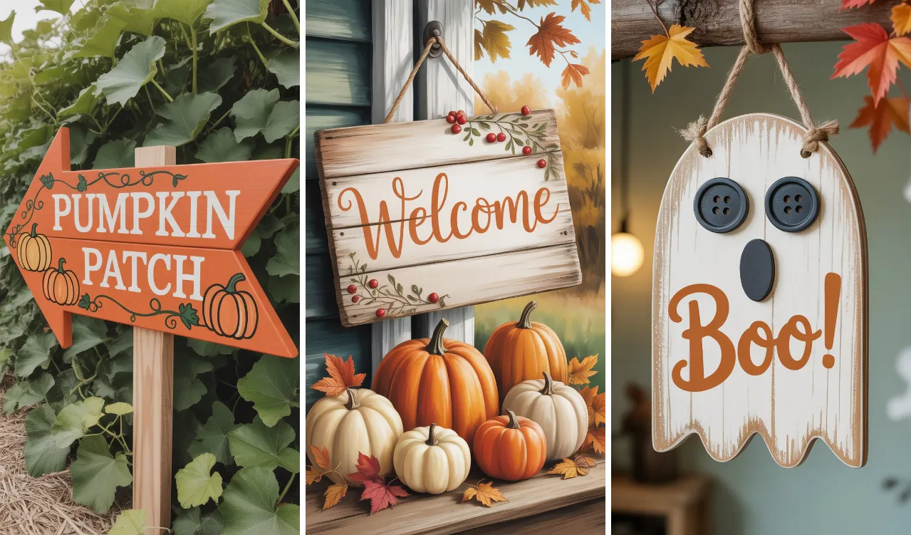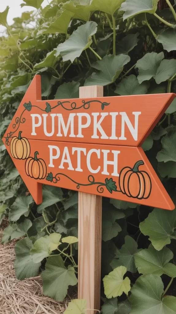 Make a wooden arrow sign pointing toward your “Pumpkin Patch.” Paint it in orange and add hand-drawn pumpkins or vines. This is perfect for outdoor décor.
