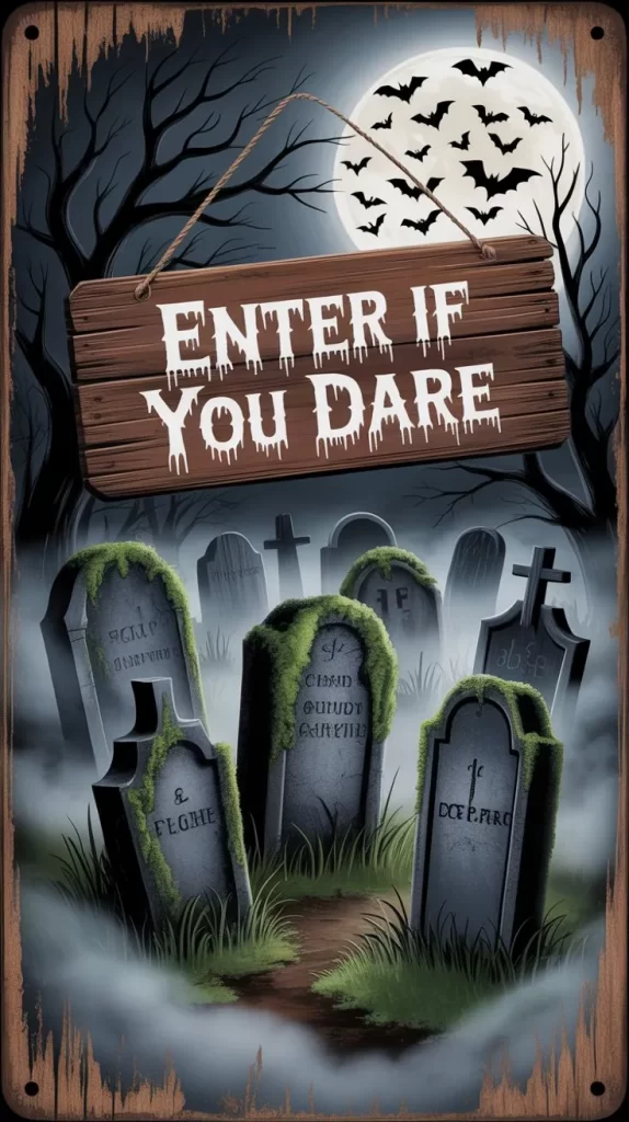 Paint a spooky graveyard with tombstones, fog, and bats. Add a phrase like “Enter If You Dare.” Place it at your entryway for a chilling effect.