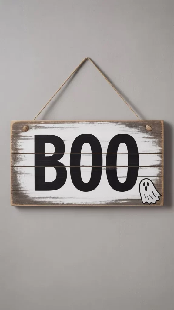 For a farmhouse look, paint reclaimed wood with a whitewashed finish. Add the word Boo in black block letters, and maybe a small ghost shape in the corner. This works well for cozy indoor spaces.
