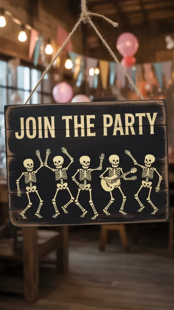 Paint stick-figure skeletons dancing on a black background with glow-in-the-dark paint. Add the phrase “Join the Party.”