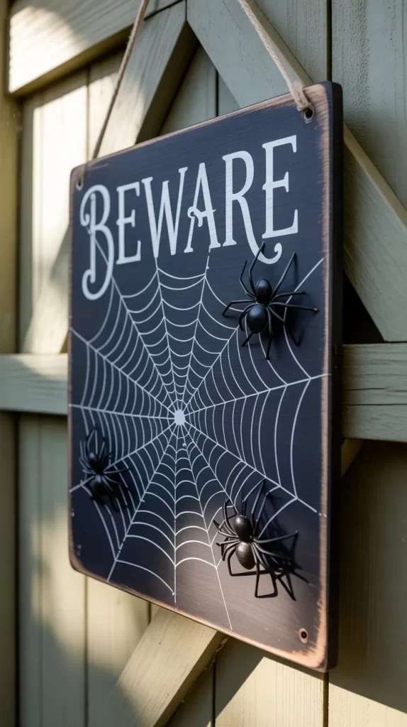 Use white paint to draw spider webs across a black wooden board. Add plastic spiders for a 3D effect. This sign looks great hung on a door.