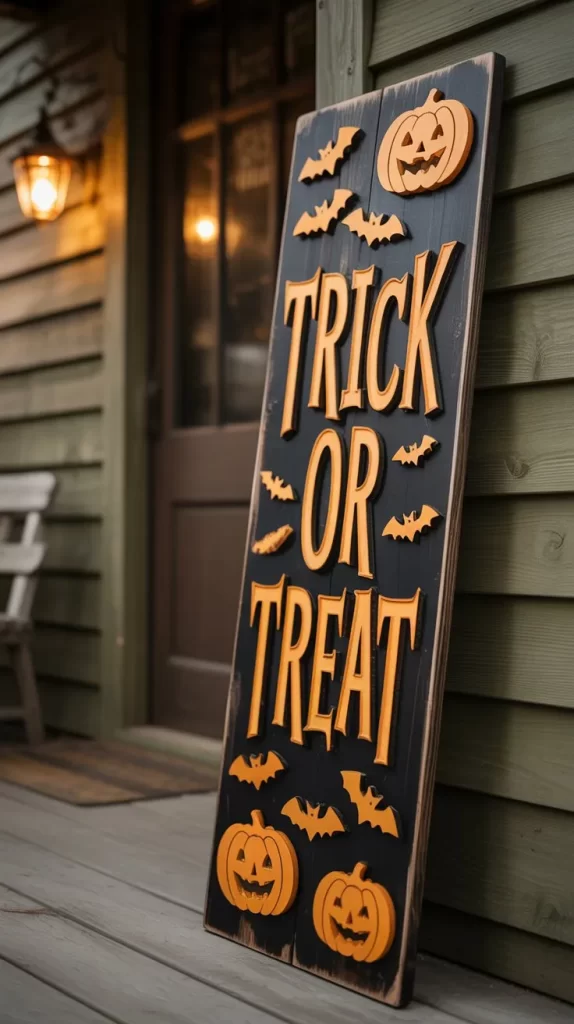Create a tall vertical wood sign that says Trick or Treat. Use black paint as the base and orange or white letters for a bold contrast. Add glitter, bats, or pumpkin stencils to make it stand out. Place it by your front door to greet guests.