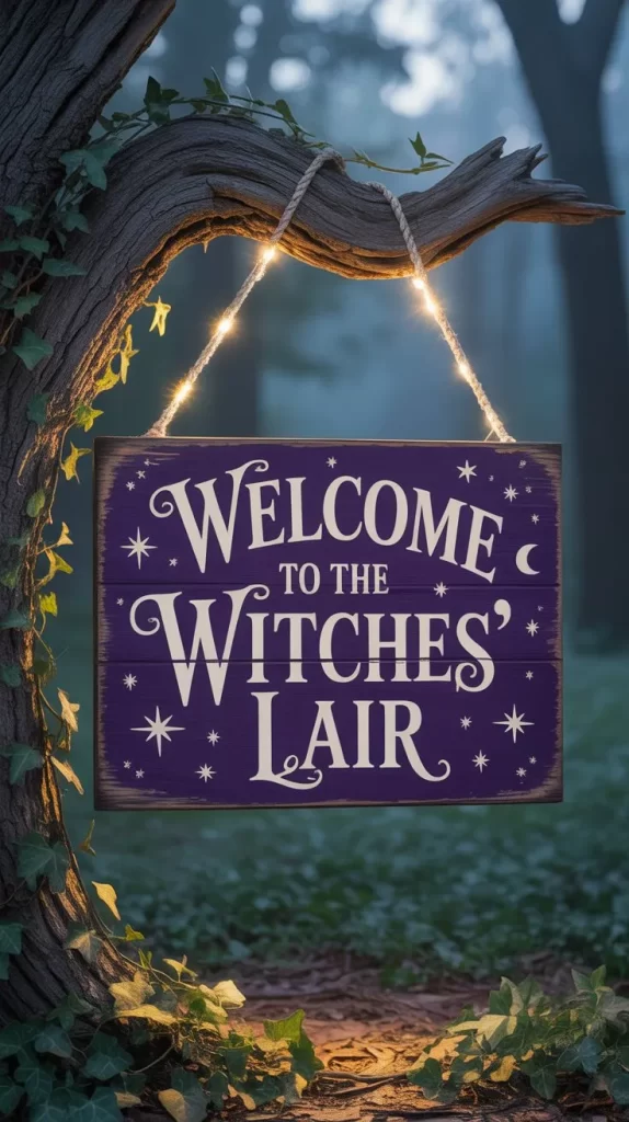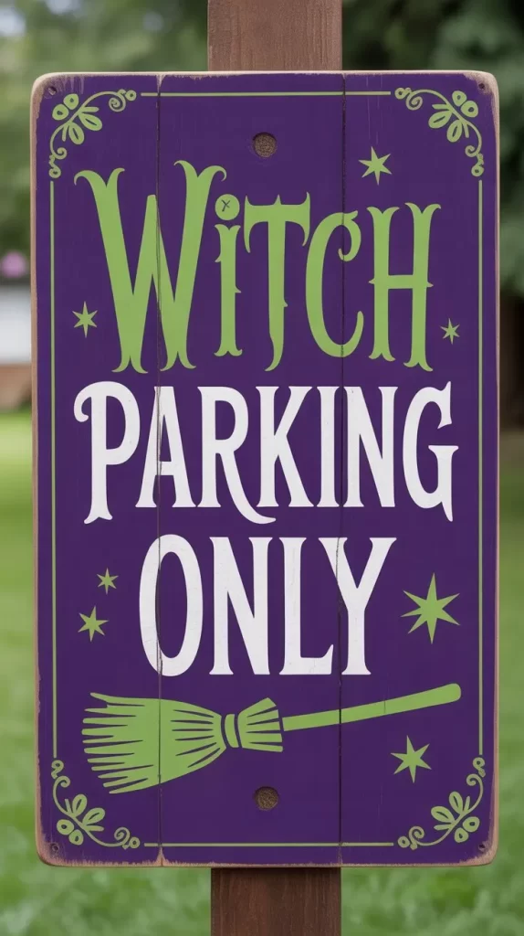 Turn scrap wood into a playful parking sign: Witch Parking Only – All Others Will Be Toad. Paint it purple or green and add broomstick graphics.