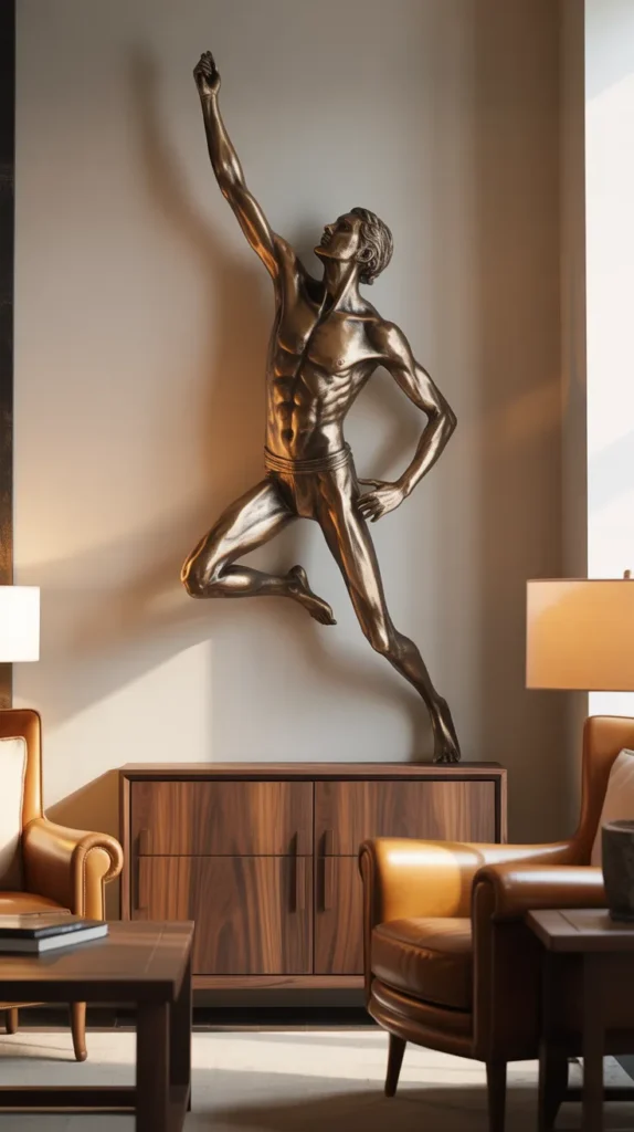Use one large piece or several smaller figures spaced along the wall. It is cost-effective because it uses vertical space that often goes unused. Instead of multiple frames, one sculpture arrangement can complete the whole area.