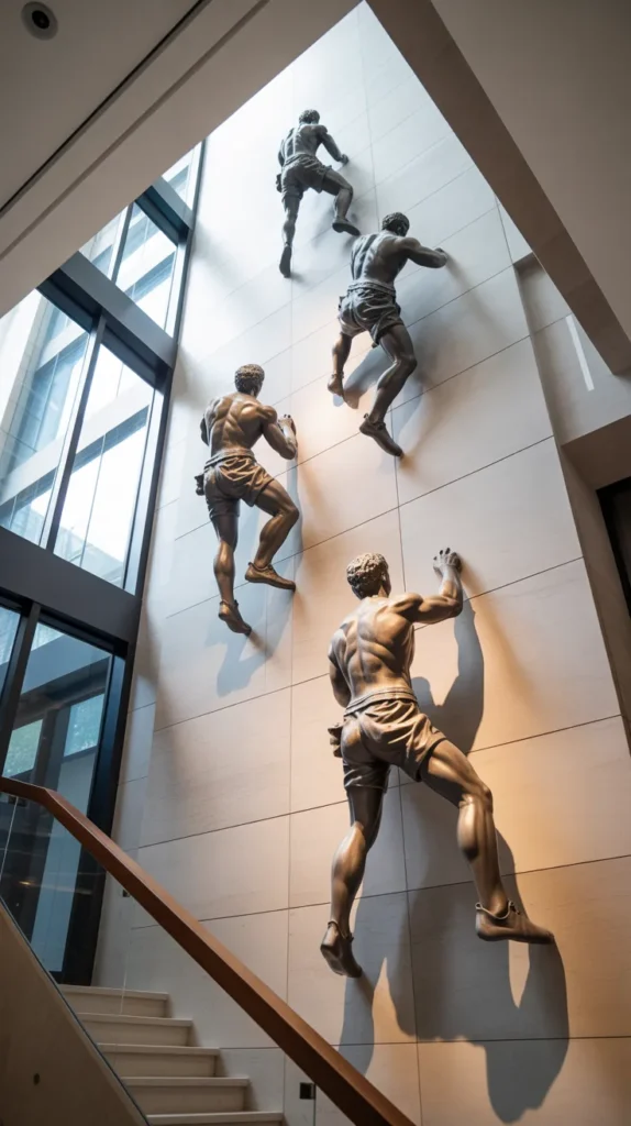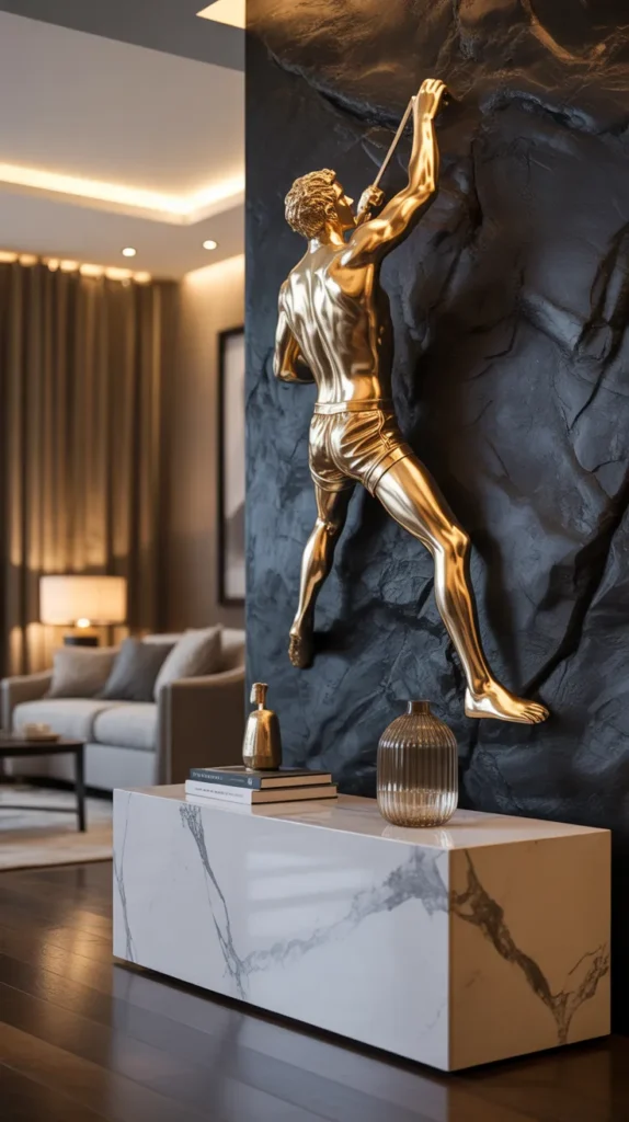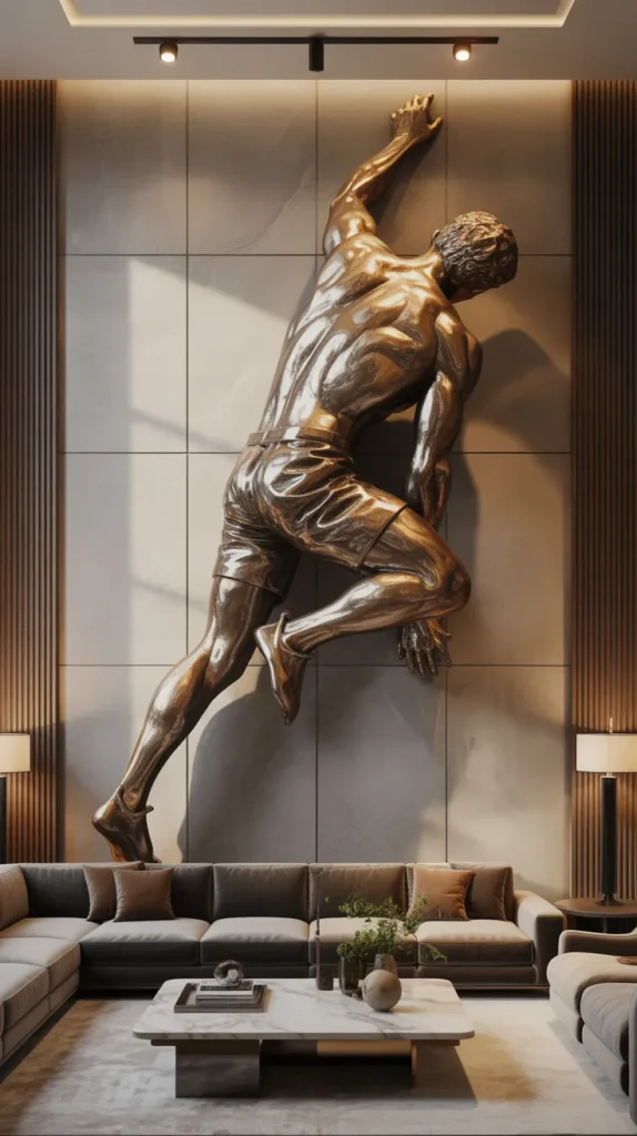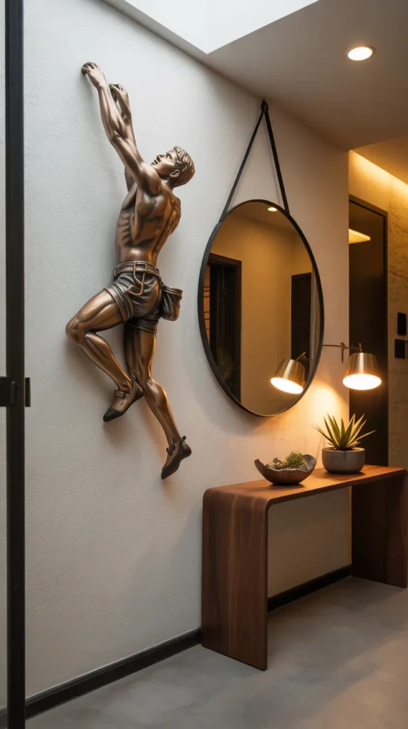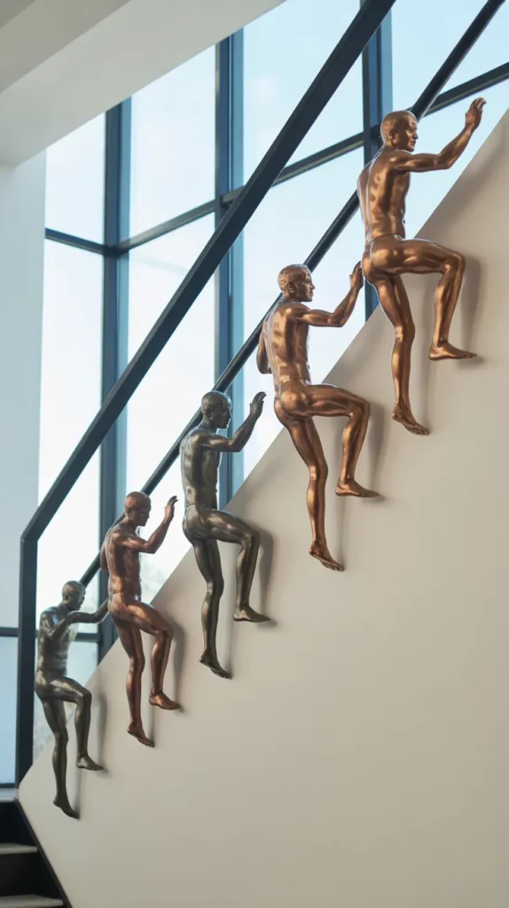 Staircase walls are often empty and difficult to decorate. A climbing man sculpture naturally fits this space because the upward movement follows the stairs. It creates a dramatic and creative look that feels custom designed. This idea works in both modern homes and apartments.