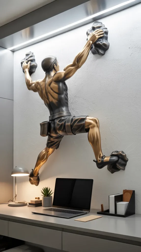 A climbing man sculpture is a great symbol of progress, ambition, and hard work. That makes it perfect for home offices or business spaces. Seeing a climber reaching upward can create a motivating atmosphere while adding modern wall decor. It turns a plain workspace into a more inspiring place.