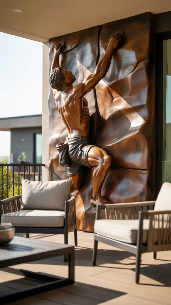 Some covered patios or balconies need stronger visual decor. A resin climber on an outdoor protected wall adds creative style and conversation value. It makes small outdoor spaces feel finished and modern.