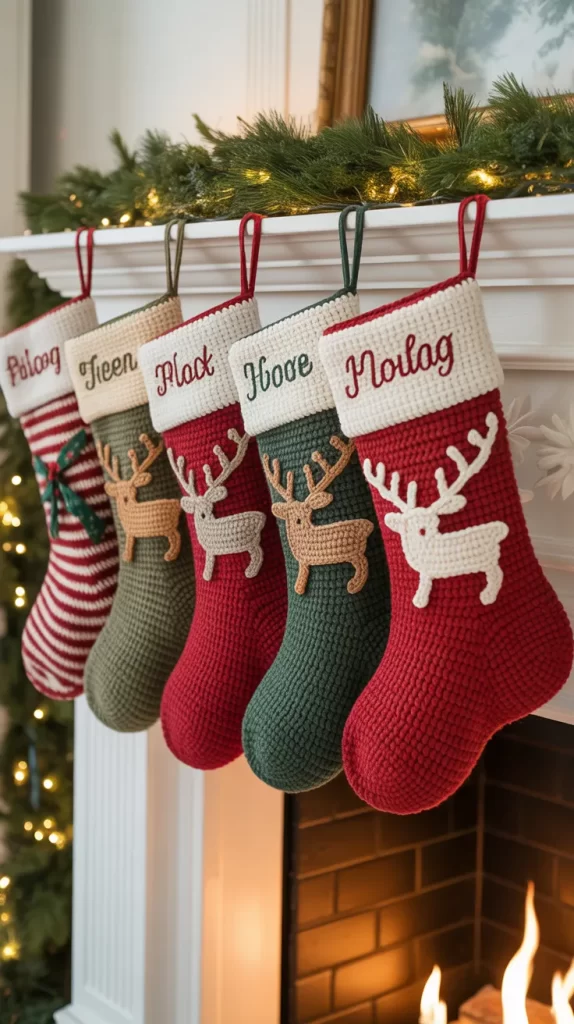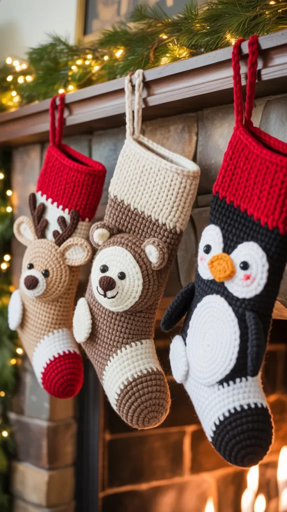 Delight the kids (and pets!) with animal-themed crochet stockings. You can create cute reindeer, bear, or penguin faces using simple crochet shapes and felt features.
