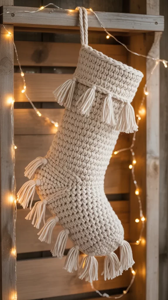 If you love boho style, this crochet stocking is for you. Use natural cotton yarn in shades of cream or beige, and add tassels or fringe for that free-spirited, relaxed vibe.