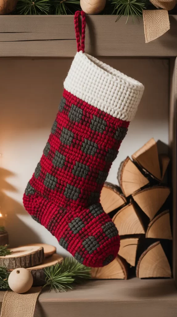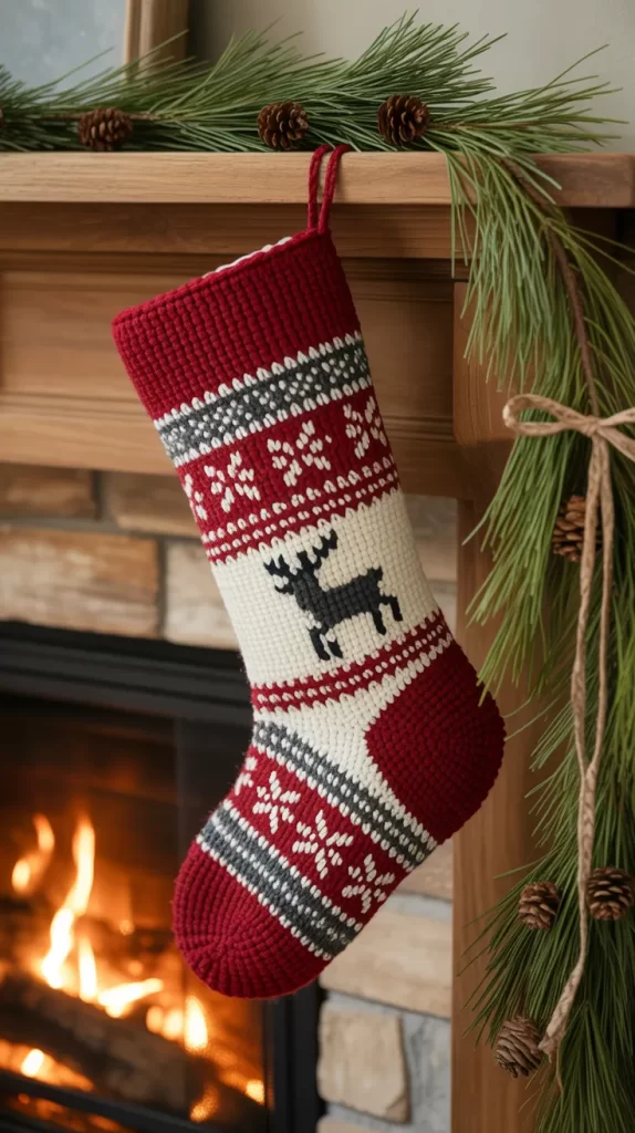 End your collection with a traditional Nordic-inspired crochet stocking. Use red, white, and gray yarns to create classic winter patterns like stars and zigzags.