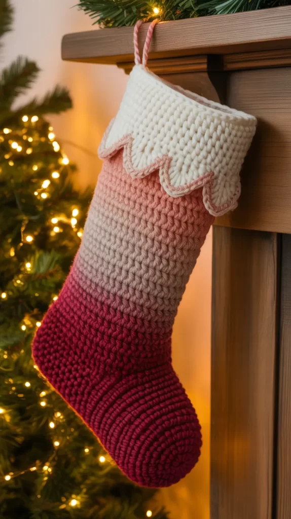 Try blending yarn colors from dark to light for a stunning ombre effect. This design gives your stocking a modern, stylish twist while still feeling festive.