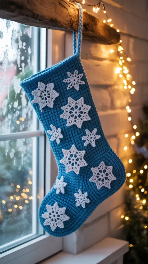 Add a wintry feel with crochet snowflakes stitched onto your stocking. Use a soft blue or silver base color and white snowflake appliqués for a frosty, elegant look.
