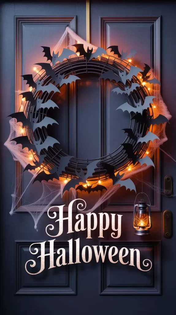 For a simple but striking design, cut out bat shapes from black cardstock or felt. Glue them around a black wreath base so it looks like a swarm flying in one direction. This wreath is minimal yet dramatic, especially when paired with porch lanterns or fairy lights.
