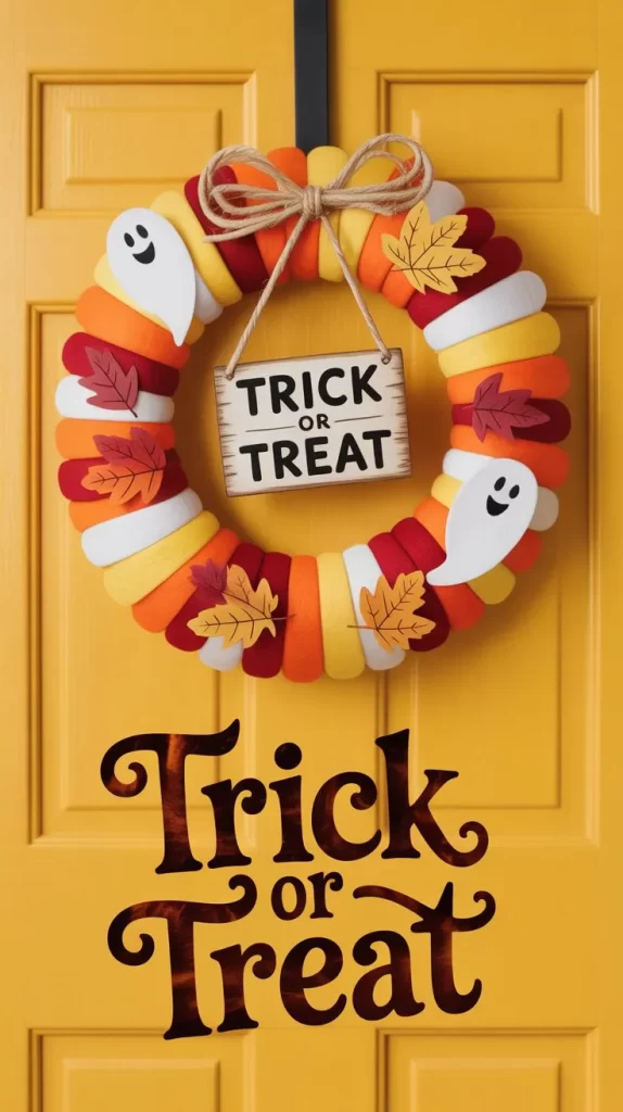 Bright, cheerful, and sweet—this wreath is inspired by candy corn. Wrap sections of orange, yellow, and white ribbon around a foam base to mimic the candy’s colors. Add a small “Trick or Treat” sign in the center for extra fun. This is a kid-friendly wreath that’s perfect for playful porches.