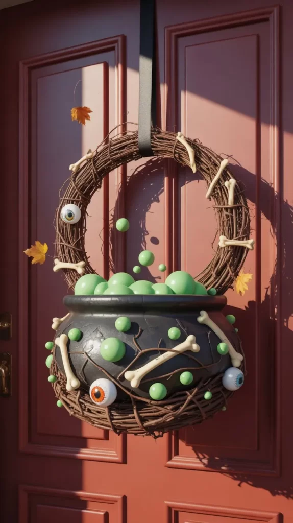 Turn your wreath into a bubbling witch’s cauldron. Use a round base covered in black mesh, then add green glitter foam or fabric to look like bubbling potion. Stick plastic bones, eyeballs, or hands around the edges to finish the look.